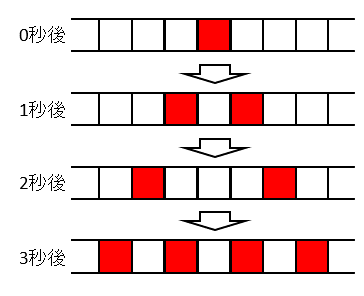 以下は、初期状態(0 秒後)から始めて、1 秒後、2 秒後、3 秒後の様子を示しています。