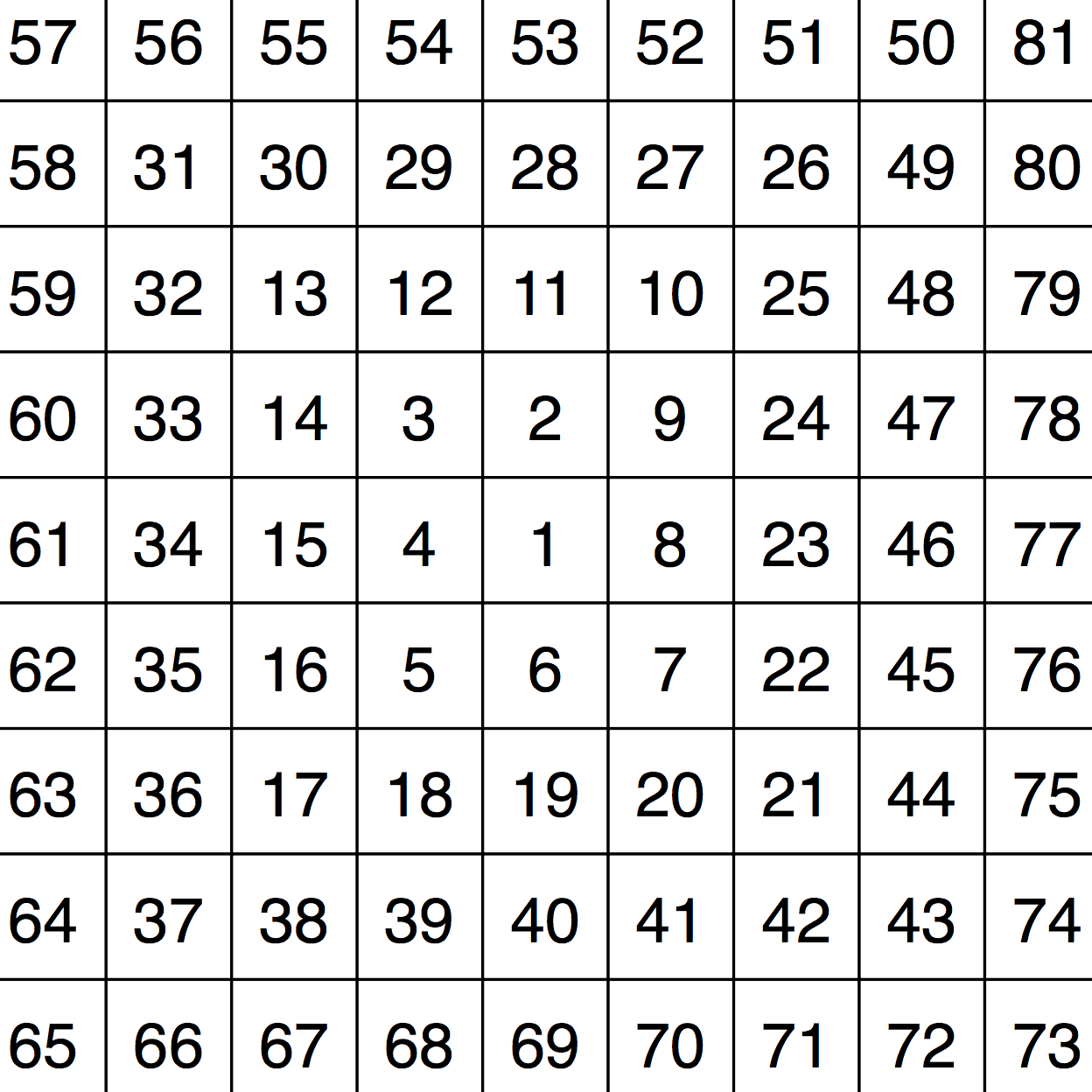 また、マップは二次元配列で表現できます。目的の数がn周目にあるとすると、マップは縦横(2n+1)あれば良いことがわかります。