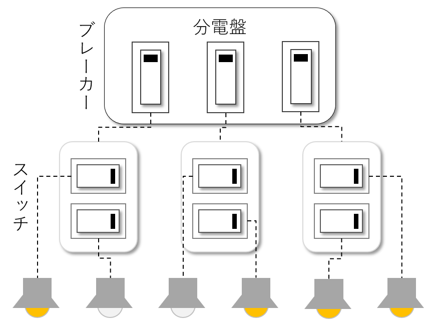 ここでは、1つのブレーカーが2つのスイッチにつながっているものとします。