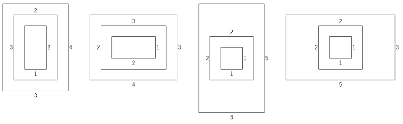 一番下の箱はその下の箱が無く、縦横の辺の長さの制約が無いのでこれだけsolve()で列挙しています(よく考えたら特別扱いの必要はありませんでした。雑感に書きます)。