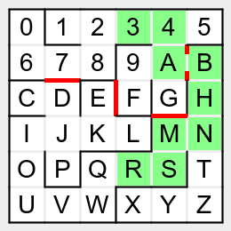 #!/usr/bin/ruby $Map = [ #0123456789abc "*************", #0 "*0*1 2 3 4 5*", #1 "* *** *** ***", #2 "*6 7 8*9 AdB*", #3 "***a*** * * *", #4 "*C D*EbF*G*H*", #5 "*** * ***c* *", #6 "*I J K L*M N*", #7 "* * ***** * *", #8 "*O*P*Q R S*T*", #9 "* *** ***** *", #10 "*U V W*X Y Z*", #11 "*************", #12 ] Gates = { "a" => [4, 3], "b" => [5, 6], "c" => [6, 9], "d" => [3, 10], } def openGate(x) Gates.each{|k, v| if k == x then $Map[v[0]][v[1]] = " " else $Map[v[0]][v[1]] = "*" end } end def position(v) for r in 0..12 for c in 0..12 return [r, c] if $Map[r][c] == v end end end def solve(gt, st, ed) openGate(gt) memo = Array.new(13){Array.new(13, 0xFFFF)} dir =[[-1,0], [0,1], [1,0], [0,-1]] ps = position(st) queue = [ps] memo[ps[0]][ps[1]] = 0 while !queue.empty? now = queue.shift pt = memo[now[0]][now[1]] + 1 for d in dir nr = now[0] + d[0] nc = now[1] + d[1] next if $Map[nr][nc] == "*" next if memo[nr][nc] < pt memo[nr][nc] = pt if $Map[nr][nc] == ed then return memo[nr][nc] / 2 else queue << [nr,nc] end end end end # main while line = gets line.strip! next if line.empty? gt, st, ed = line.split("") p solve(gt, st, ed) end